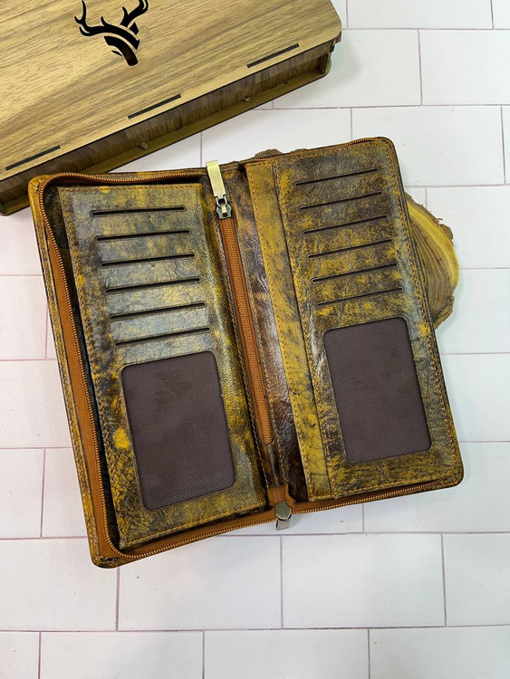 کیف پول مردانه دور زیپ دسته چکی دست رنگ چرم طبیعی گاوی