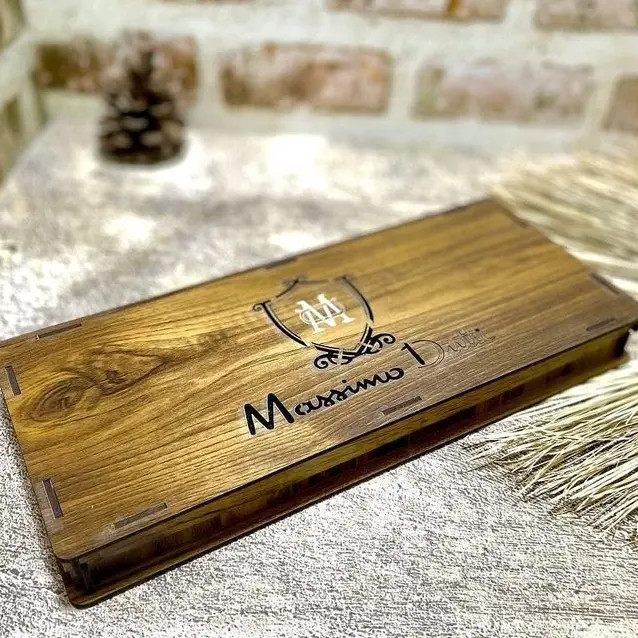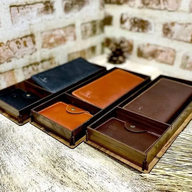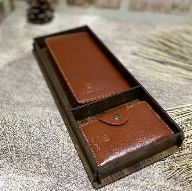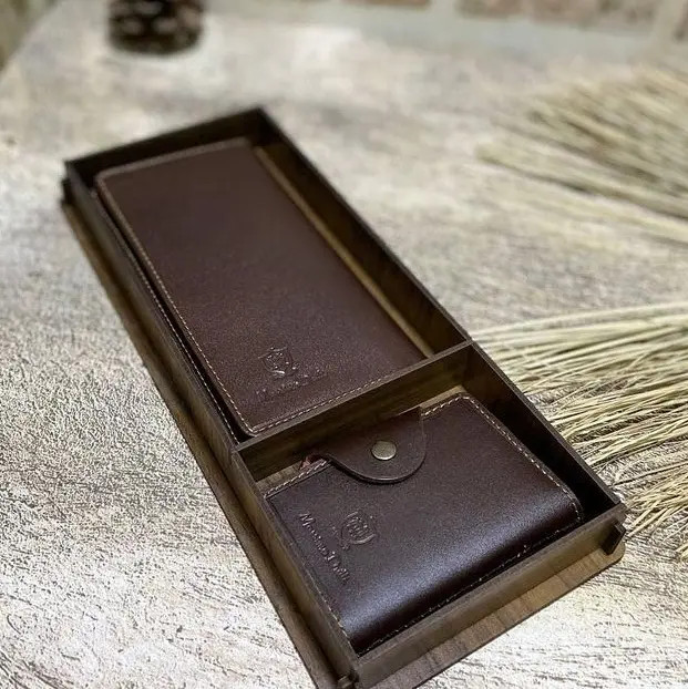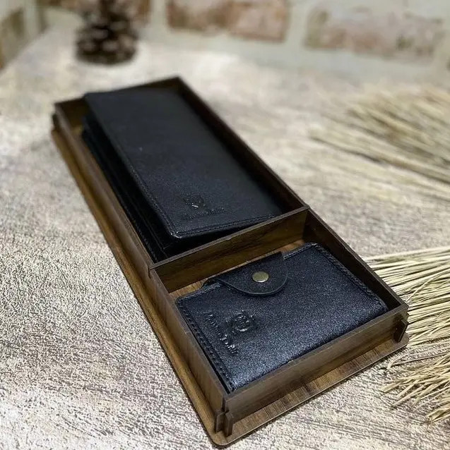 پک هدیه کیف و جاکارتی چرم طبیعی مردانه همراه با باکس چوبی