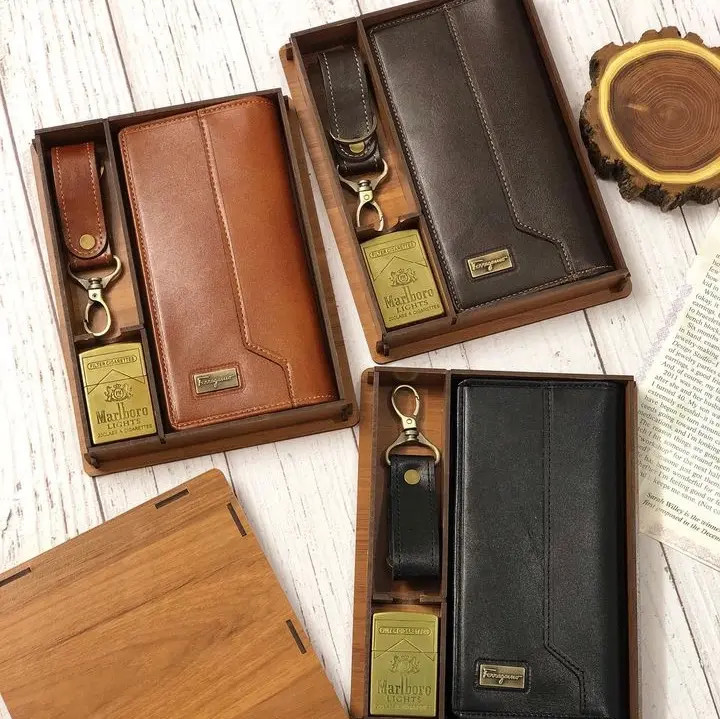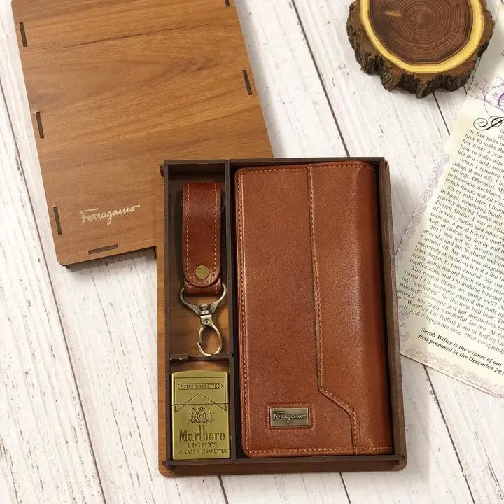 ست كيف و جاكليدي و فندك چراطبيعي فراگامو همراه با جعبه چوبي كادويي شيك موجود در سه رنگ اصلي