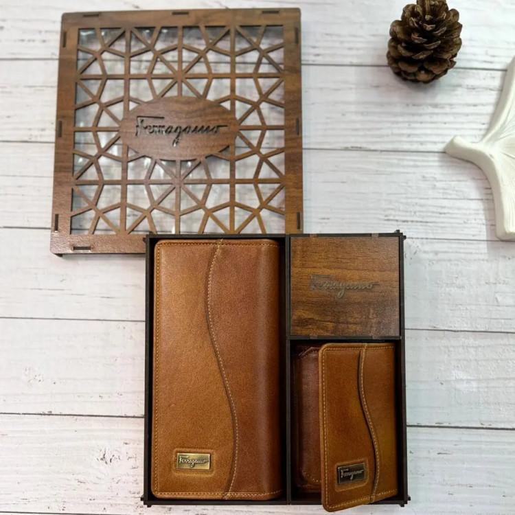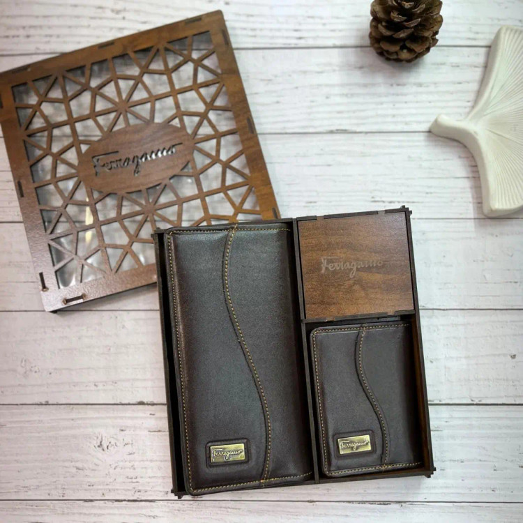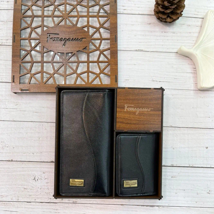 ست کیف پالتویی و جاکارتی چرم طبیعی فراگامو با جعبه کادویی شیک